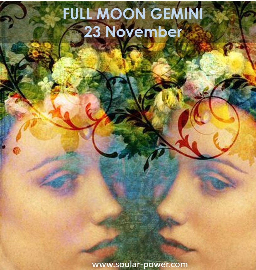 Full moon November 23rd is in Gemini, opposite the Sun, Jupiter and Mercury in Sagittarius and squaring Mars. This makes for a big, rather blustery, restless, perhaps slightly opinionated or impatient energy, which you might be feeling even now, in the lead up to the full moon.
